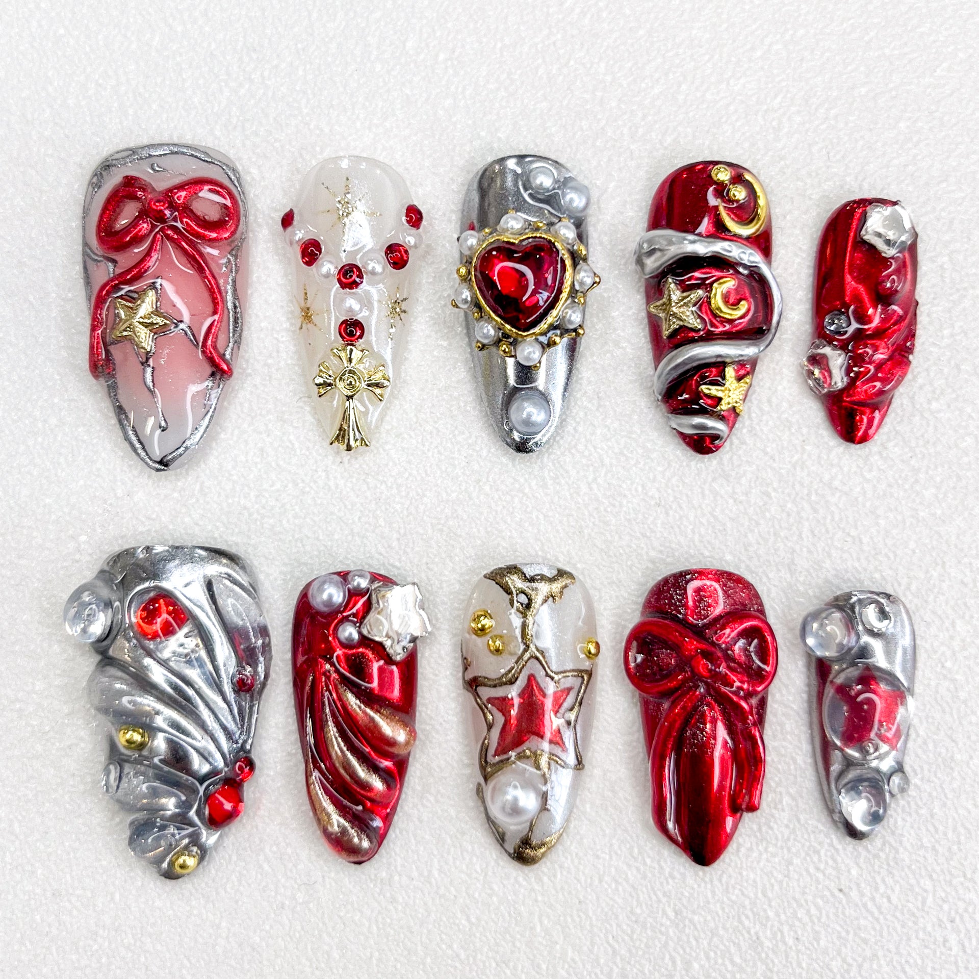 Celebrate in style with our Festive Glamour collection featuring 10 dazzling press-on nails. This luxurious set combines rich ruby red, shimmering silver, and elegant gold tones with ornate details including jeweled hearts, delicate bows, sparkling stars, and golden crosses. Each nail is adorned with pearls and gemstones for maximum sparkle. Perfect for the holiday season or any special celebration where you want to shine.