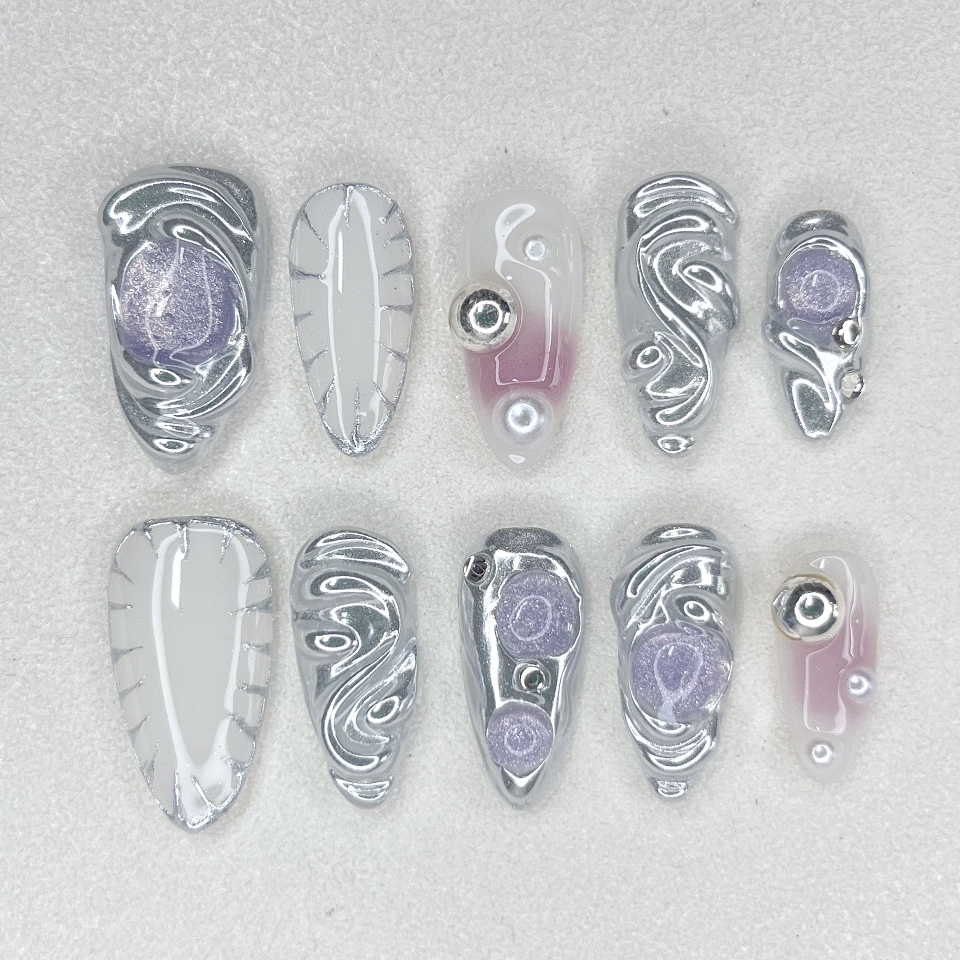 This futuristic set features 3D chrome swirls, dreamy lavender cat eyes, and ethereal translucent bases for an otherworldly vibe. Perfect for nights out or festivals where you want to feel like a cyber goddess.